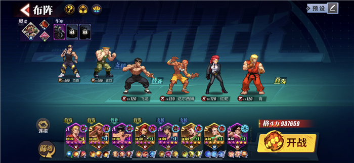 想要达成火队的自动连招就需要上阵合适的火队格斗家。建议上阵红蛇、肯、达尔西姆、飞龙。连招激活分为必杀起手——连招1——连招2——连招3。