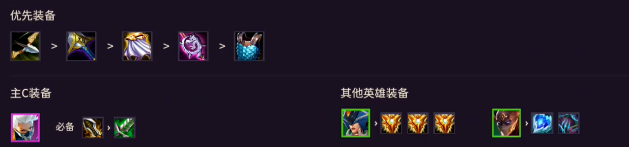 潜龙剌:无尽、汲取剑、火炮/飓风/蓝霸符影疾忍主C可考虑珠光护手、无尽、蓝霸符。霜卫首领/天雷引:钢铁烈焰之匣越多越好。海上幽影:冰心、莫雷洛秘典
