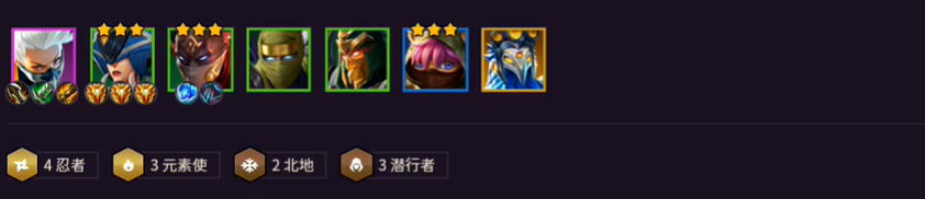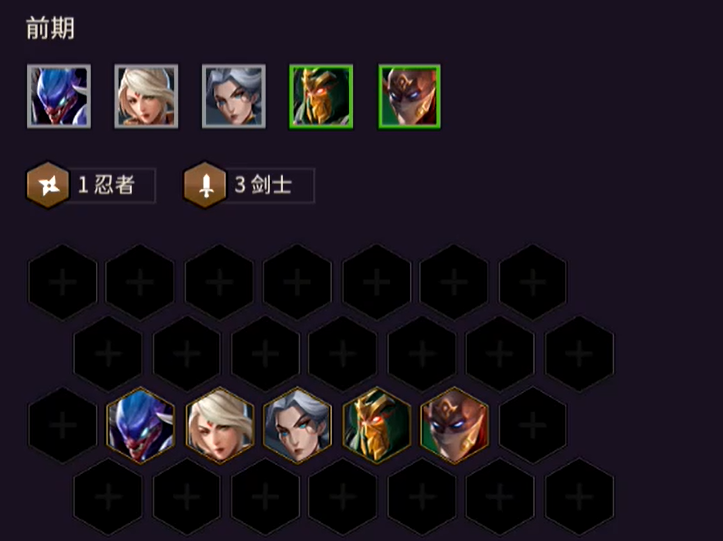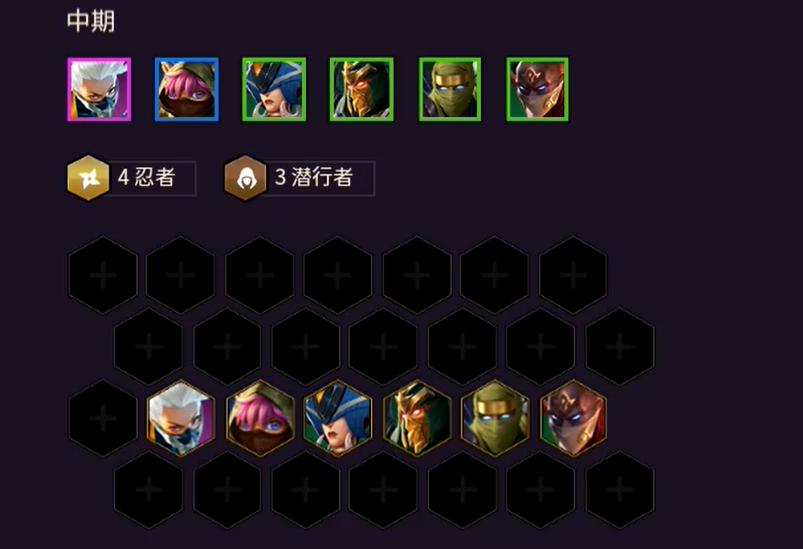 2阶段:主要以稳定血量为主,打工棋子选择看自身来牌如剑士多就三剑士过度,如潜行者多就3潜行者过度。3-2阶段 就可以升级6人口,继续以稳血为主,如果在3阶段选秀能拿到潜龙刺就可直接开4忍+3潜行者阵容,强度可直接拉满。