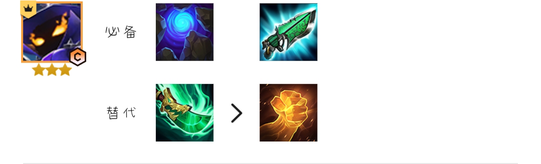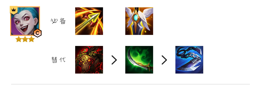 装备选择:卡特狂徒、水银必备,替代复活甲、正义、龙牙。剩余装备去做劫的装备,最佳三件套为火炮、法爆、无尽。
