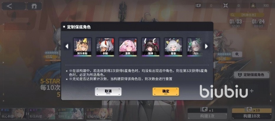 比较特殊的就是构筑池,与其他的活动池up不一样,构筑当中,玩家们是可以自己自定义保底角色的,也就是说,在该构筑卡池当中,如果连续获得两星角色之后,均没有出现我们保底的角色,那么第三次六星角色无论如何都必定为所选角色。也就是说,运气再差的话,也会在第150抽的时候获得我们定制的保底角色。