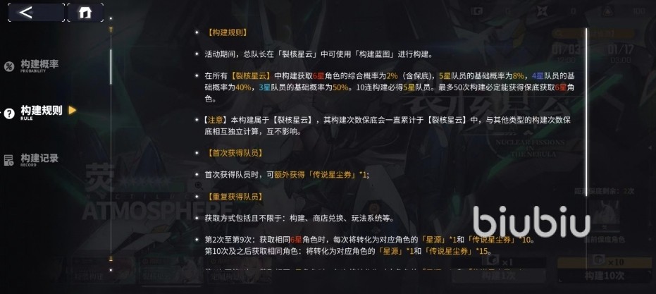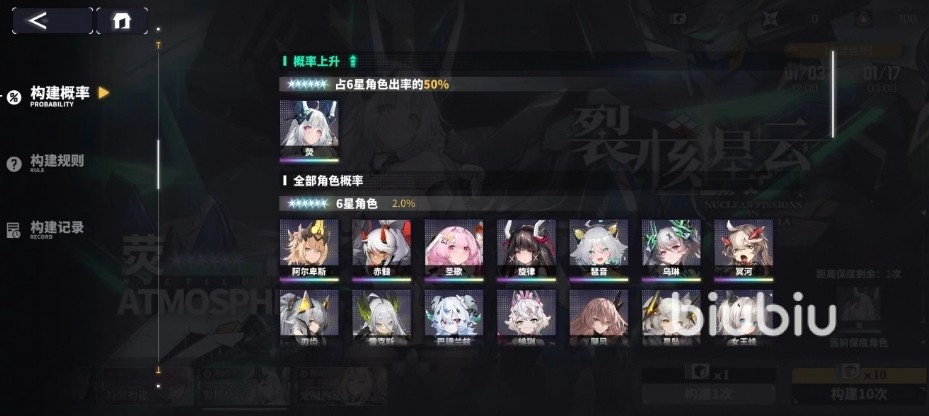 首先是游戏的卡池规则和几率,一般情况下,所有的核心构件当中获取六星角色的概率为2%包含保底,五星角色的基础概率为8%,四星角色的基础概率为40%,三星角色的基础概率为50%,一次十连必出一个五星及以上角色。同时,每个卡池的核心构筑最多50次,必定会获得保底的六星角色。