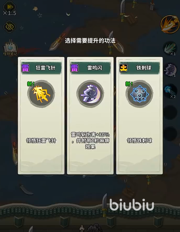连环掌法也十分不错能让玩家额外再释放一次霹雳掌,最后面的选择除了加伤害外,还要选择一个雷法精通属性,这个选择能让霹雳掌减少20%的冷却时间,如果大家能看到10个方向发射雷球的属性也是必选的,能极大提升攻击范围。