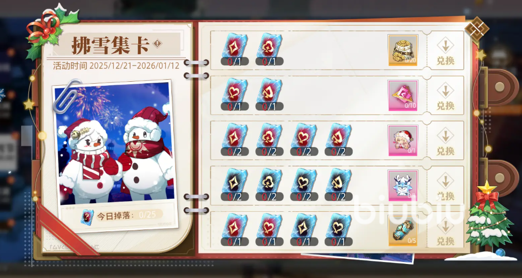 除了上面这些内容外,全新的拂雪集卡玩法和新的圣诞主题家园装饰也上线了。只要通关副本收集并交换凝冰扑克,就可以得到限定表情包和往期橙卡奖励。家园系统也新增节日装饰,大家可以自由布置。