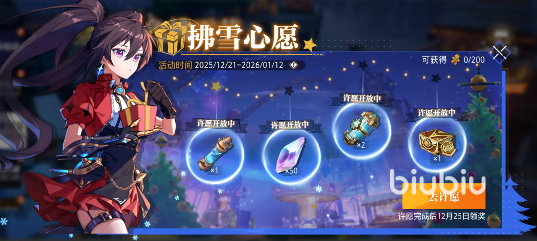 然后是12月21日到24日开启的雪季心愿玩法,在银淞树下许愿,完成许愿后从25日开始就能陆续领取各种奖励,除了前面提到的徽记模块自选盒、圣物之芯,还有晶珀。