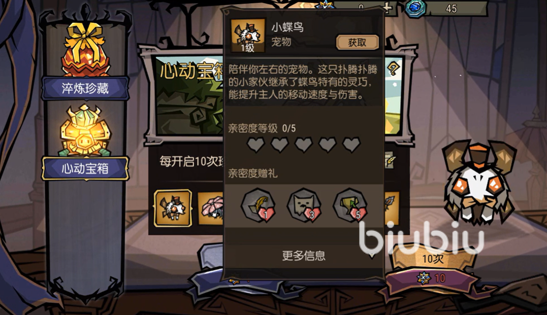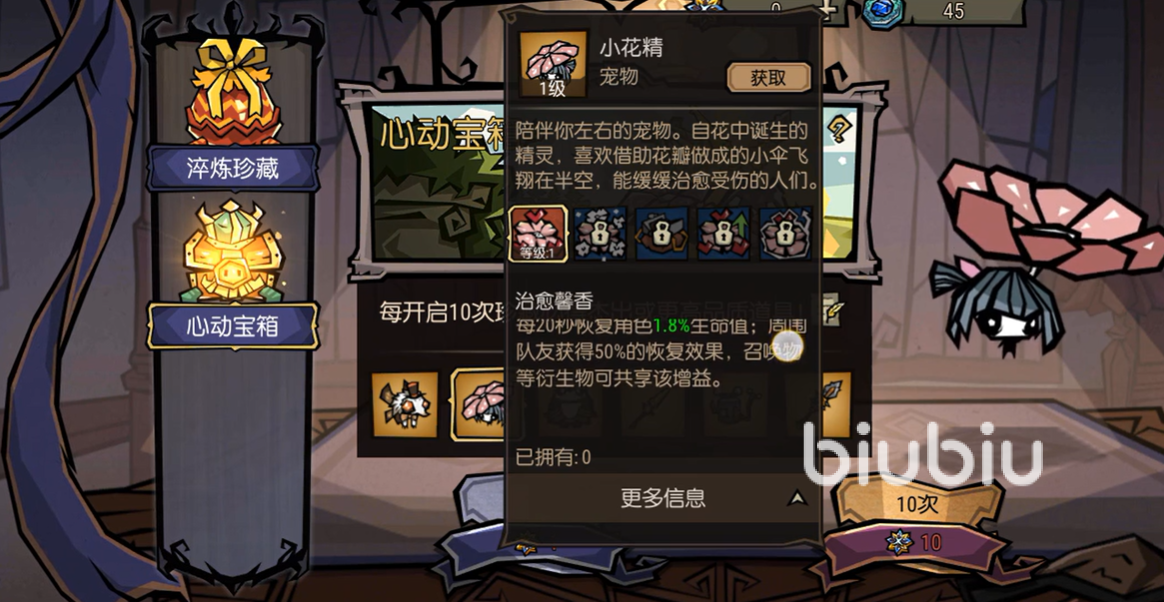 然后另一类宠物也需要抽卡获得,这个宠物就是小花精,能提供小范围的治疗技能,随着亲密度的提升,还可以提高额外的攻击力。