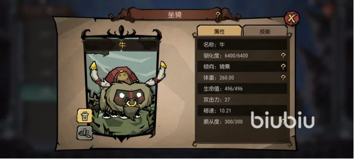 如果捕捉到了牛之后,大家就可以在家园的坐骑页面中来查看这只牛的属性了,没错游戏中的坐骑也是有属性的,有的牛的属性很好,而有的则很差,所以如果自己当前抓到的这头牛的属性不好的话,建议还是再去捕捉一头属性更好的牛来当坐骑才行。