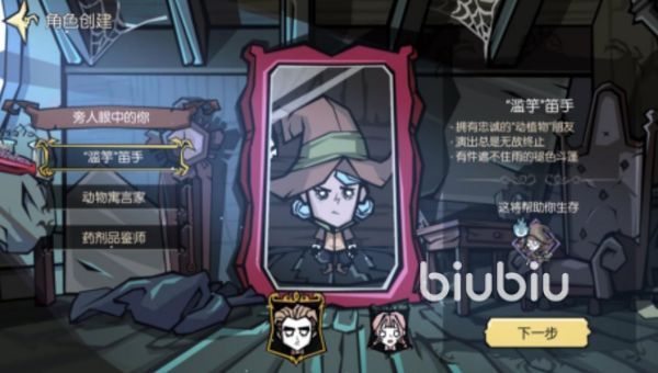 性别选择好之后就可以选择角色了,在该游戏中有三个不一样的角色,分别是笛手,预言家和品鉴师,他们各自效果不同,笛手可以召唤老鼠来收集资源,预言家可以解锁动物预言集将怪物的仇恨清空,品鉴师可以解锁药剂,给自己恢复理智或者生命,而且还有夜视效果的药剂哦。