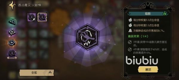暗影套装的效果是让角色每分钟恢复3.3的生命值,而且他对蜘蛛造成的伤害会提高6.7%,当大家获得的是两件套的话,会让角色获得15%的伤害加成,四件套的话,角色智力值低于60%的时候,伤害则会提高15%。