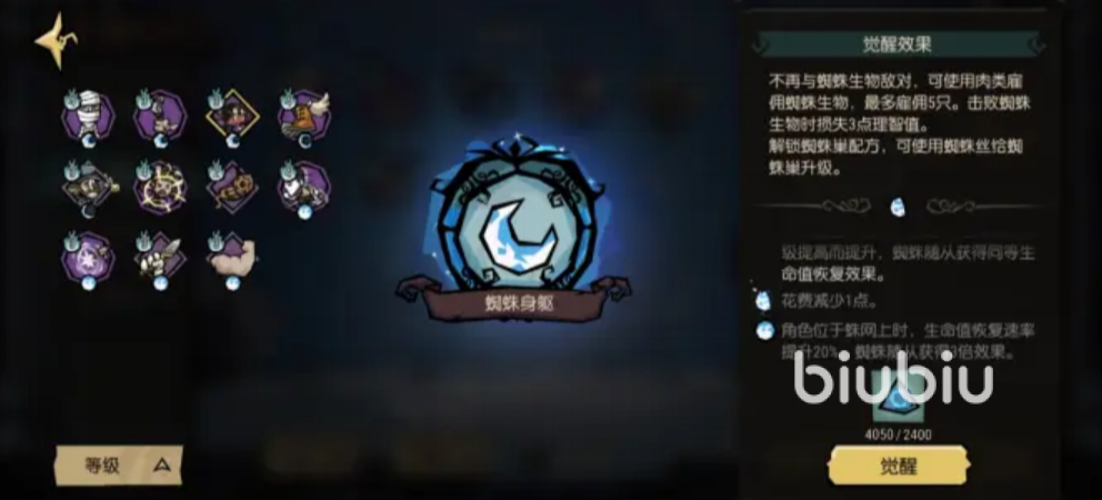 比如这个蜘蛛之躯的技能,平平无奇,但是选定这个觉醒的界面之后消耗蓝色的三角之后就能获得上面显示的技能让玩家能够雇佣蜘蛛,让该特质的角色获取更多的攻击方法,甚至能改变了这个角色的相应玩法。