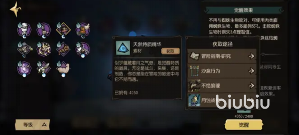 想要觉醒的话首先达到要求的条件才可以,然后根据图中所示的获取途径,多刷一点以便自己获取足够多的资源,觉醒之后填充各种物质会让玩家解锁更多的孔位,这些位置还能安放其他特质,保证玩家有足够的实力去挑战更多的其他怪物。