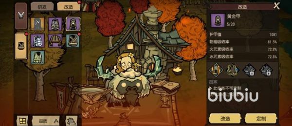 护甲改造:在护甲的下面有一个改造按钮,使用该按钮只需要消耗一定的属性以及材料就可以增加它们的具体护甲值以及吸收率,增加护甲的强度哦。