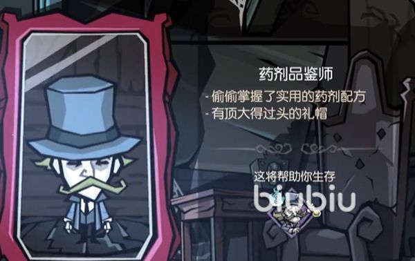 第三个是药剂品鉴师,他偷偷的学习了大量的药剂配方,使用这些配方就可以搭配出很多不同的药剂,这些药剂可以给大家带来很多额外的帮助哦,在外观上他最大的特点就是有一个比自己脑袋还大的礼帽,还有一个八字胡,非常有特色。