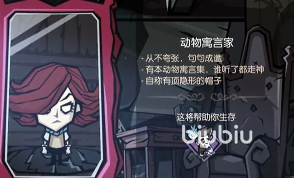 动物寓言家有着一头红色的头发,它在游戏的绅士设定中有着一张出口成真的嘴,基本上只要是他说的话都能成为真实的,而且还有一本名为动物寓言集的书,只要听到讲述这个书上的内容,周边的所有目标都会清空仇恨。