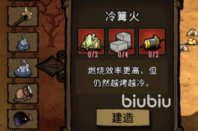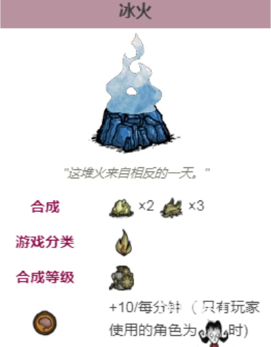 这些就是全部的介绍了,当然这个火对于放火女的被动也是有效果的,靠近火堆还是会恢复脑残值的,当然这个火的效率不是很高,所以当玩家有更好的材料的时候,使用图中所示的材料可以制作更好的冷篝火,这个火堆属于冰火的上位替代,使用起来会更加的方便,千万不要忘了制作。