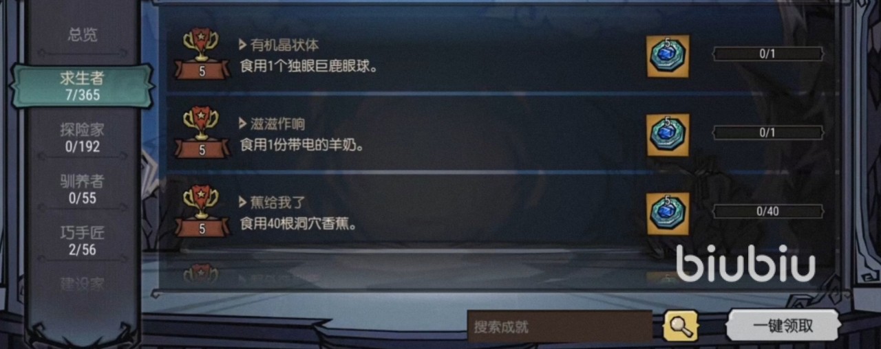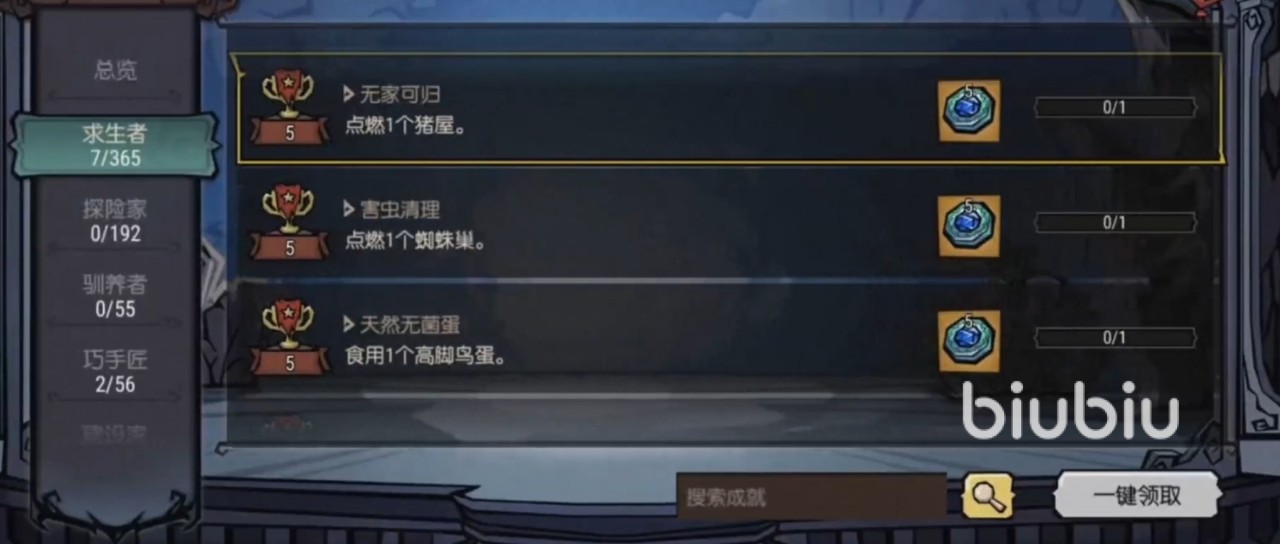 7.无家可归:玩家用火炬点燃一个猪人房屋就能完成;8.害虫清理:蜘蛛在游戏里算是一类害虫,玩家点燃1个蜘蛛巢就算是清理了害虫啦;9.天然无菌蛋:食用1个高脚鸟蛋来补充体力就能达成这一成就;10.有机晶状体:食用1个独眼巨鹿眼球,听起来略有恐怖,不过,其实这一食物还是很好获得的;11.蕉给我了:玩家需要食用40根洞穴香蕉来达成它,好在洞穴香蕉很容易采集。