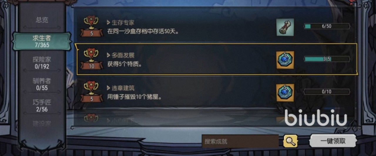 1.生存专家:玩家需要在同一个沙盒世界中存活50天的时间,就能完成这一成就点;2.多面发展:玩家需要获得五个特质才可以达成该成就点;3.违章建筑:游戏里的猪人村落中是有很多不规范的小屋子滴,玩家只要用锤子摧毁10个猪屋就行;4.小心脚下:在游戏中,玩家可以依靠陷阱来抓捕动物,大家只要放置10个犬牙陷阱便可完成这一成就点;5.斩草除根:点燃1个猴子桶就能达成这一成就点;6.移动火炬:玩家在探索的时候,会遇到一些妖精树精,拿火炬点燃一个树精守卫就能完成该成就点。