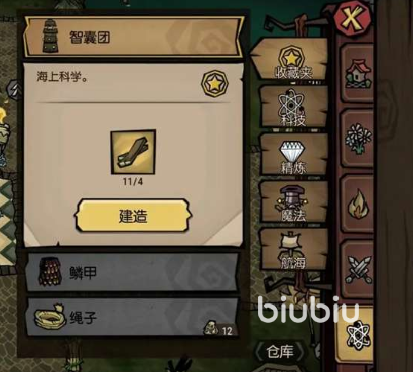 航海属于初级科技,但是玩家还是需要通过科技树将里面的智囊团进行解锁,解锁完毕以后就可以开始制作出大型船只以及船只用具,方便玩家们更好地渡海,点击航海图纸,在图纸上面有各个配件的制造材料,大部分材料都是可以通过小岛屿内部进行收集的。