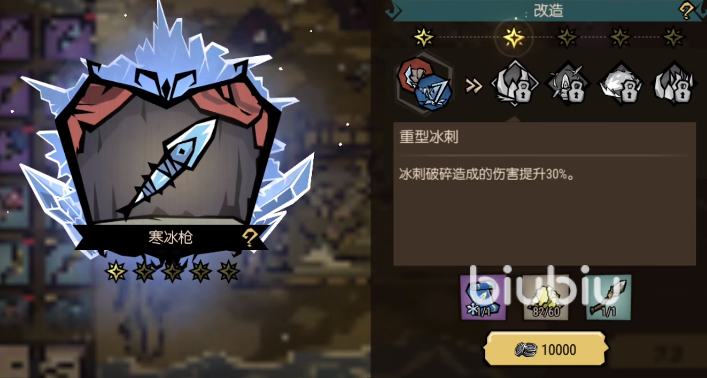 在游戏的卡池中,其奖励是比较齐全的,除了一些限定的武器以外,也是会有很多强力的道具,同时能够通过获取到的道具以及材料来自行打造强力武器,其中10抽就能有机会解锁武器以及宠物,其中武器的品质也是在紫色及以上,会附带两个不同的技能,像寒冰枪,就能为大家带来控制以及冰冻的效果。