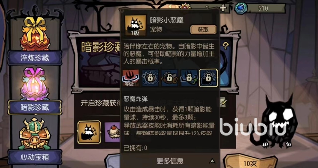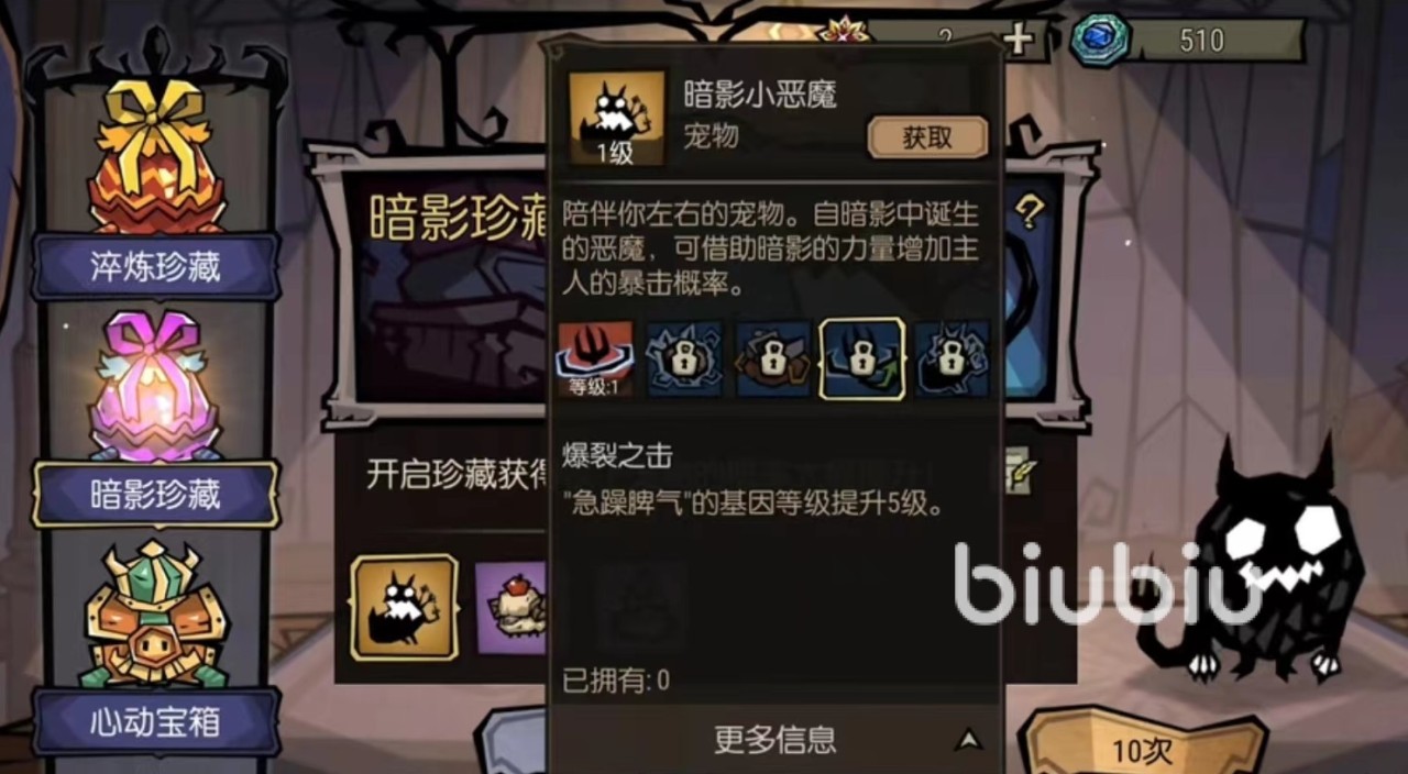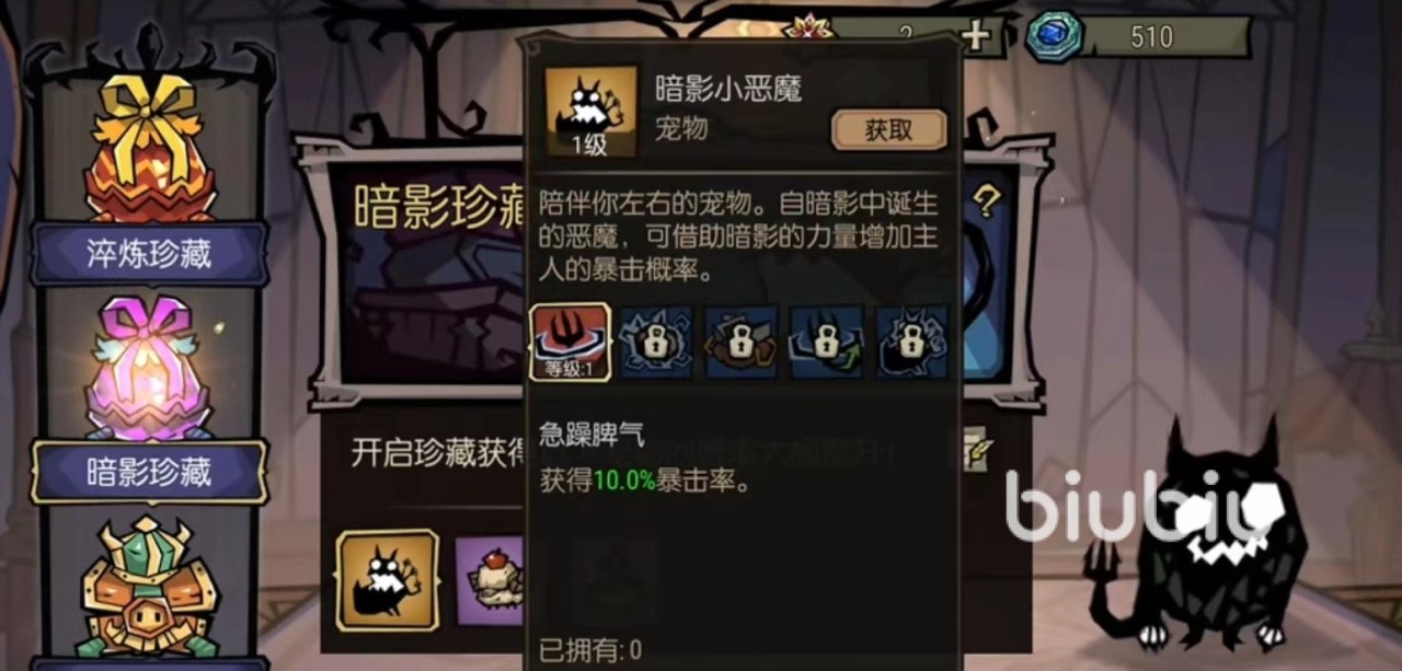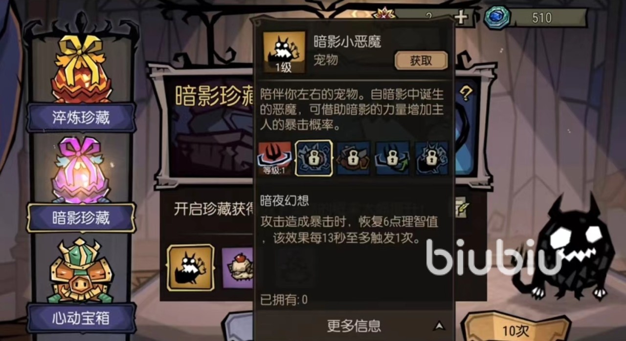 这是来自于暗影珍藏池子中的橙色宠物,抽取之后陪伴左右是来自暗影中的恶魔,战斗中利用暗影力量增加主人暴击概率。所以第1个技能急躁脾气,可以使其主人增加10%暴击率。第2个技能暗夜幻想,当攻击造成暴击时将会恢复6点理智值,该效果13秒内只能触发一次。