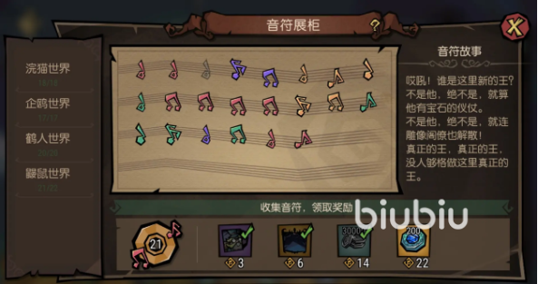 音符藏在四个世界之中,分别是浣猫、企鹅、鹤人以及鼹鼠四种世界,下面主要是关于浣猫世界的音符收集,大家可以根据上面这张图来按顺序寻找音符,顺序是按照展示框内的顺序来标记的,大家可以查缺补漏。