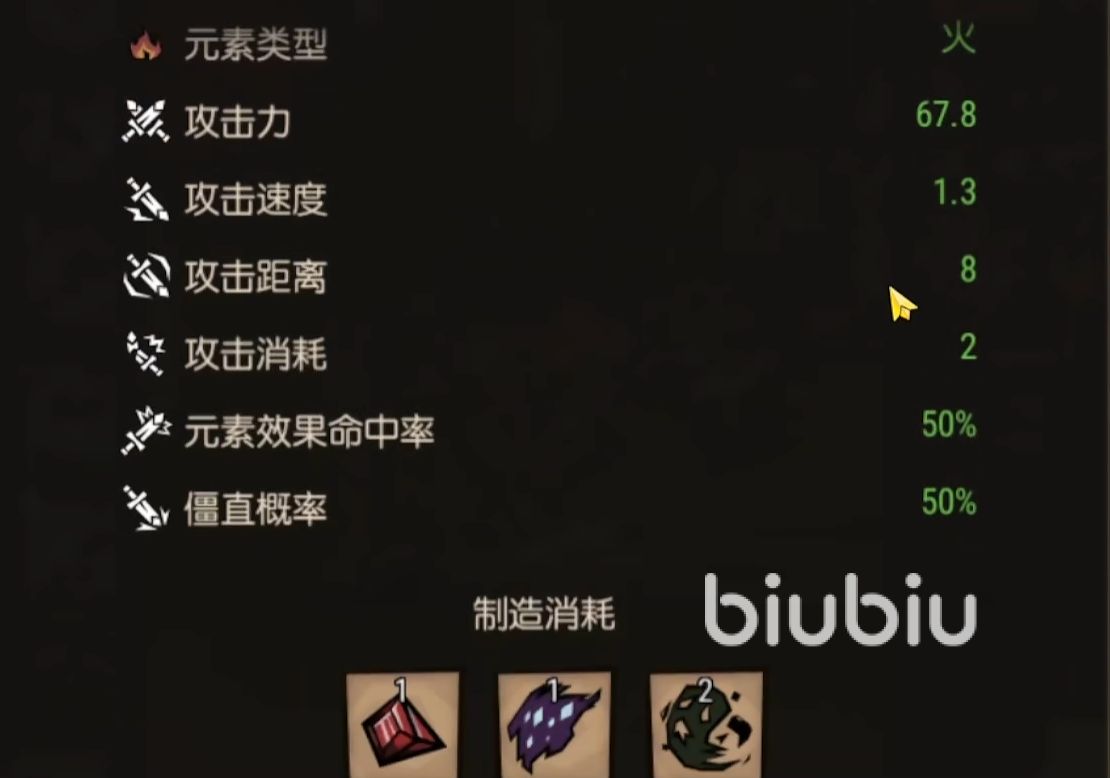 攻击速度为1.3,也有点低,在远程武器来看,它的伤害还算正常数值。每次攻击或造成火元素伤害,对付害怕火的怪物有特效,释放技能时会对范围内的生物造成火伤害,不仅会点燃目标,还会破坏范围内的物品,还会出现熔岩触手协助攻击。