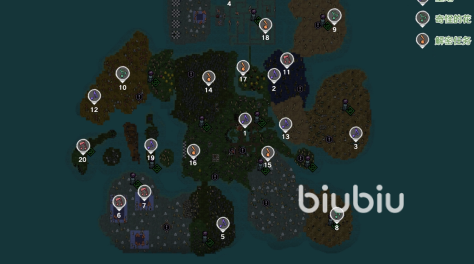 游戏中有浣熊世界、企鹅世界、鹤人世界以及鼹鼠世界四个收集音符的世界,上面的图就是鹤人世界的20个音符的位置,20个音符顺序是按照展示柜里的顺序来标注的,玩家们可以根据图中的音符位置去挨个寻找搜集。