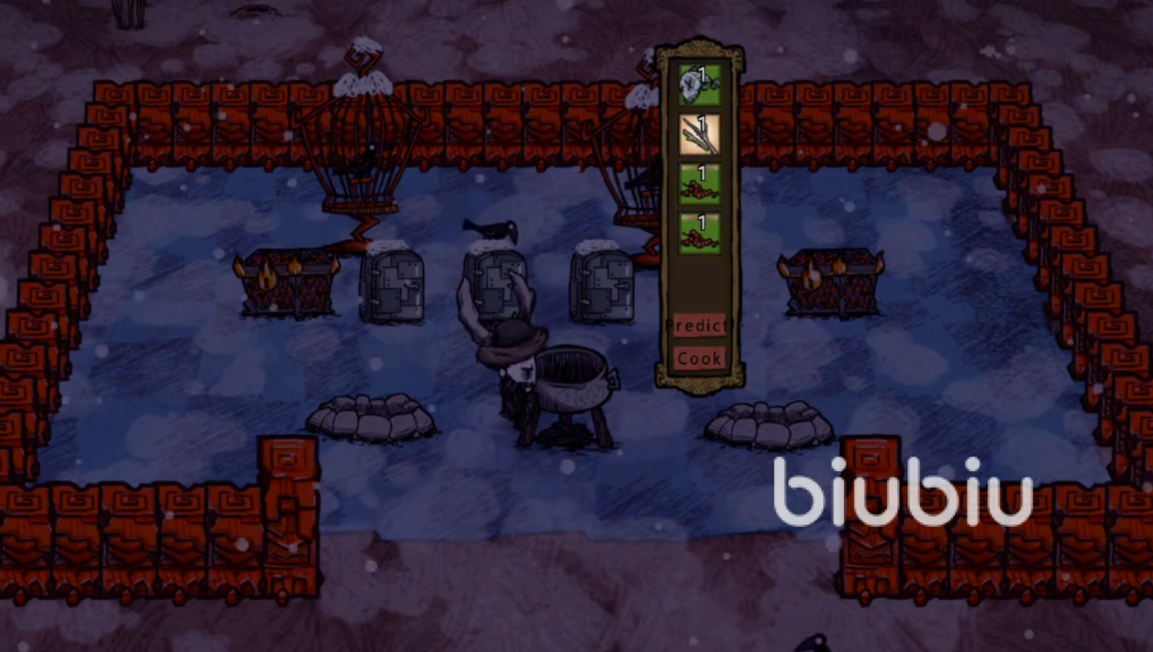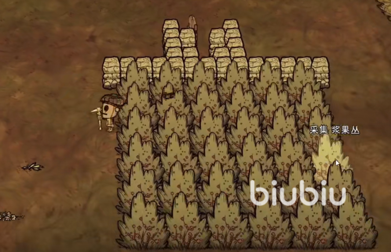 最后一个就是最常见的前期食物--浆果,在野外多如牛毛大家还能将植被直接移植回自己的家园附近,方便采摘以及管理,偶尔还会刷出火鸡,非常的适合新手玩家培养,材料齐全之后将两个浆果放入锅里面就大工告成了。