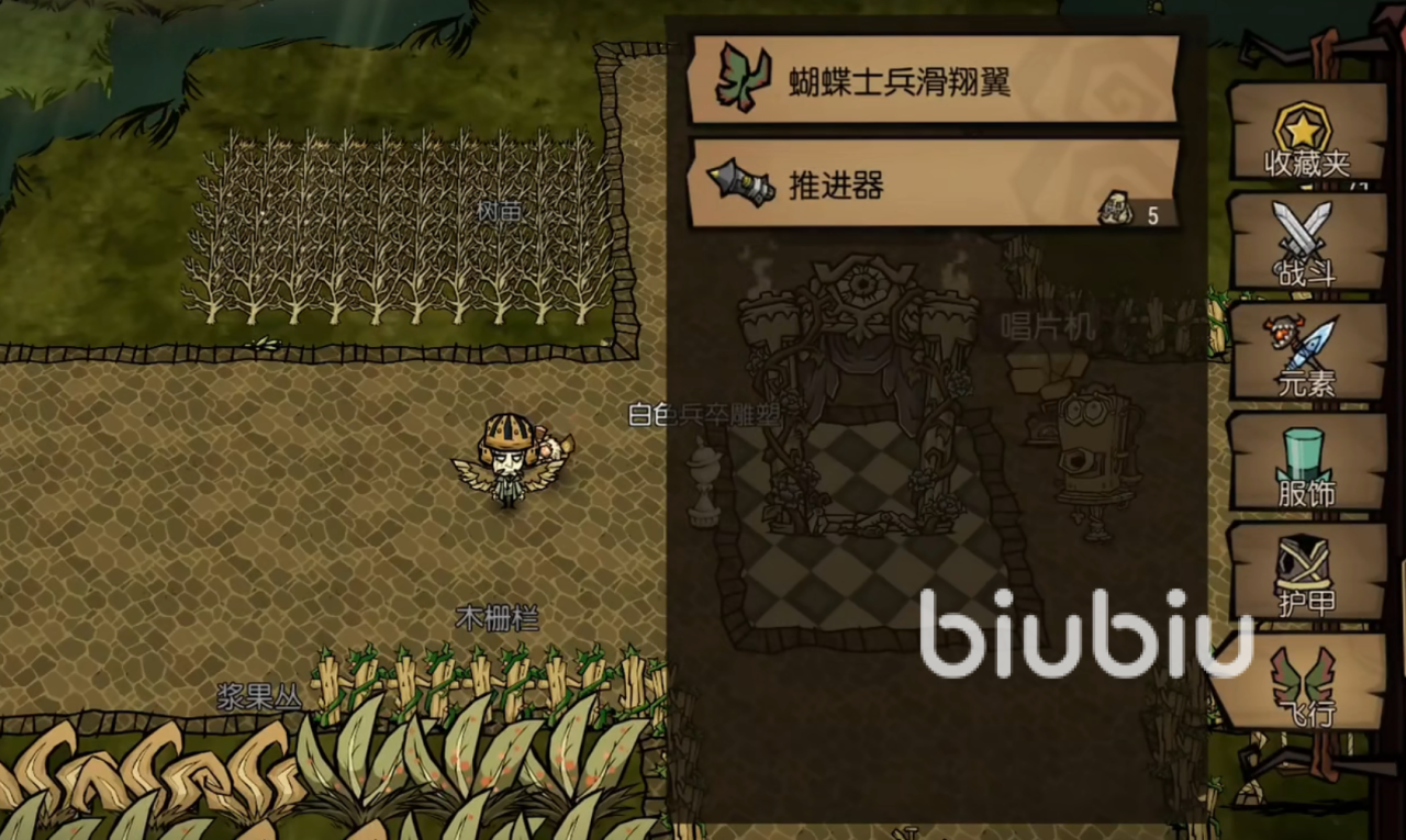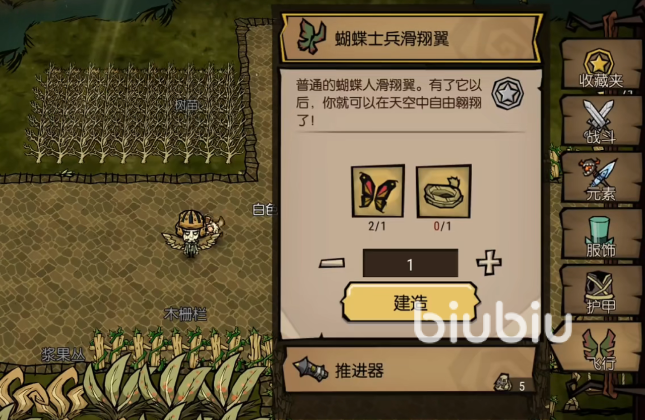 需要的最基础的材料就是蝴蝶以及绳子,蝴蝶可以在花的旁边捉到,只要注意自己的走位很容易获取,绳子需要玩家收集干草,这个地上遍地都是然后合成就能获取了,这样就能解锁这个翅膀了。
