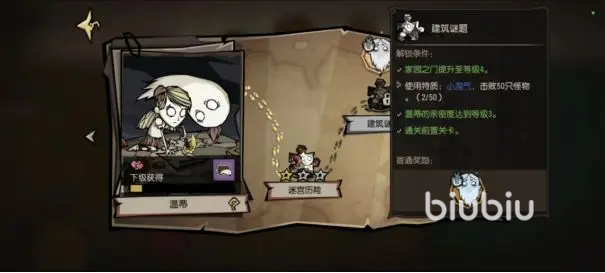 只要将NPC的好感度刷到3级,然后利用特质击杀50之怪物,怪物最好使用蜜蜂或者蜘蛛来对付它们,接下来第二关就开启了。第二关是建筑谜题,这关的主要任务就是建造出指定图形建筑。首先第一步就是将木箱里面的道具,锤子和铥矿墙捡起来,接下来就根据对称的准则来建造就好。