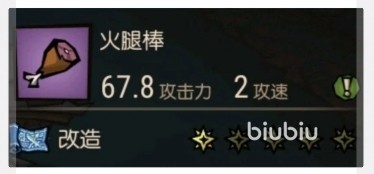 在前期能做的装备里,这个武器的攻击力可以说是效果最好的了。在材料上需要一块猪皮,2个大肉,一根树枝。这些材料在前期还是很稀缺的,武器好用不过也有缺点,这个武器有一定的新鲜度,这一点也和其用大肉做的属性比较契合,适合打血厚的boss。