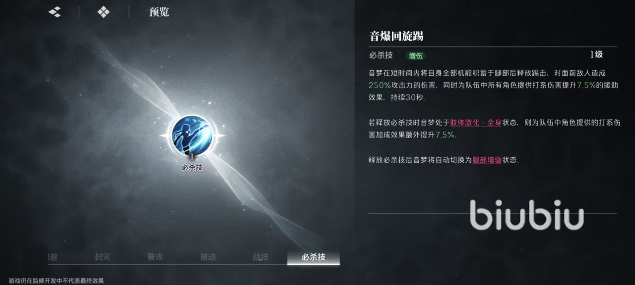 必杀技音爆回旋踢,在短时间内将自身全部机能积蓄于腿部,然后释放踢击,对面前敌人造成高额伤害,同时为队伍中所有角色提供打系伤害提升的援助效果,持续30秒。如果释放必杀技时处于肢体激化全身状态,那么队伍中角色提供的打系伤害加成,还有额外提升效果,在释放必杀技后,涅音梦将自动切换为腿部增驱状态。