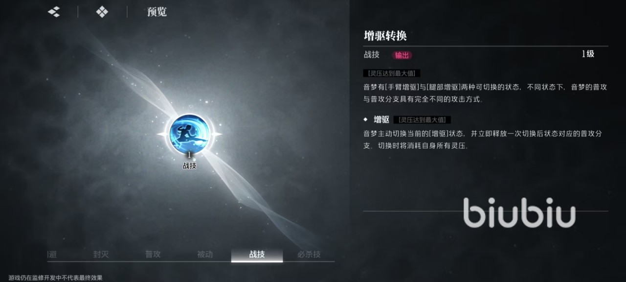 战技增驱转换,涅音梦具有手臂增驱和腿部增驱两种可切换状态,在不同状态下,普攻和普攻分支也具有不同的攻击方式。灵压达到最大值时可以释放增驱,主动切换当前的增驱状态,并释放一次切换后状态对应的普攻分支,切换时将消耗自身所有的灵压。在释放封灭的时候,除了造成伤害之外,也会将自身的灵压立即积累至最大值,释放封灭反击后自动切换为腿部增驱状态。