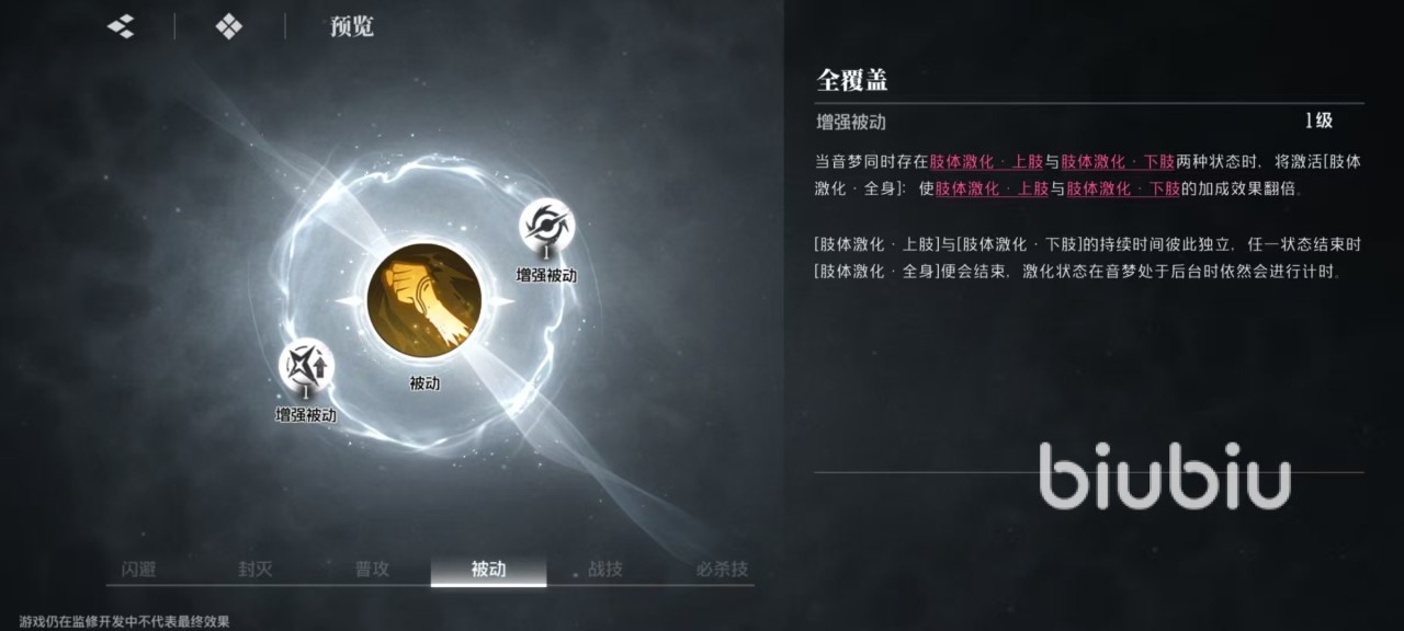 涅音梦的核心被动是全覆盖,当涅音梦同时存在肢体激化上肢和下肢两种状态时,将激活肢体激化全身,使得上肢和下肢加成效果直接翻倍。上肢和下肢的持续时间是彼此独立的,任意状态结束时,肢体激化全身便会结束。肢体激化在涅音梦处于后台时依然会进行计时。另外还有两个增强被动,使得聂涅音梦的攻击力提升,肢体计划下肢的加成效果提升。