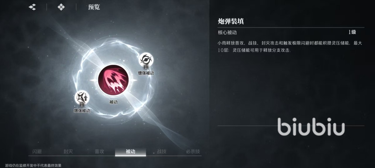 䌷屋雨的被动是炮弹装填,无论释放普攻、战技还是封灭攻击以及触发极限闪避时,都可以积攒灵压储能,最多能叠加10层,灵压储能可以用于释放分支攻击。在另外两个增强被动的影响下,当敌人位于燃烧区域时,䌷屋雨的灵系伤害提升,位于燃烧区域的敌人会额外降低移动速度和攻击速度,该效果在敌人离开燃烧区域的两秒后结束。