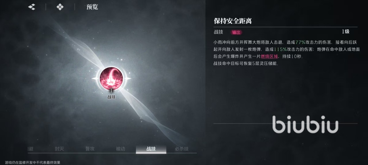 战技保持安全距离,向前方冲锋并挥舞大炮将敌人击溃,接下来后跃起并向敌人发射一枚炮弹,再造成一次伤害。炮弹命中敌人或者地面后会产生爆炸,生成一片燃烧区域,持续10秒钟。如果战技命中目标可以恢复5层灵压储能,处于燃烧区域的敌人会每秒受到持续伤害。必杀技危险全部排除,向敌人倾泻炮弹,造成高额攻击力的伤害,命中敌人后会在敌人脚下生成一片燃烧区域,持续10秒钟。