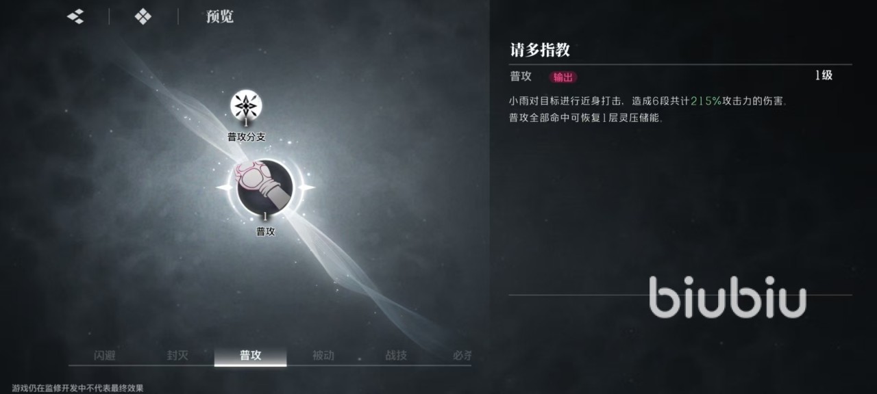 除了技能之外,䌷屋雨的普攻可以对目标进行近身打击,造成六段伤害,如果普攻全部命中可以恢复一层灵压储能。普攻分支则是进入瞄准射击状态,通过点击普攻可向目标发射炮弹,炮弹能穿透最多两个目标,对后续造成持续伤害,每次发射需要消耗一层灵压储能。封灭效果是用大炮击退敌人,向其方向发射炮弹造成伤害和击飞,并在其脚下生成燃烧区域,如果反击命中目标可以恢复5层灵压储能。