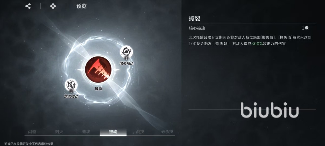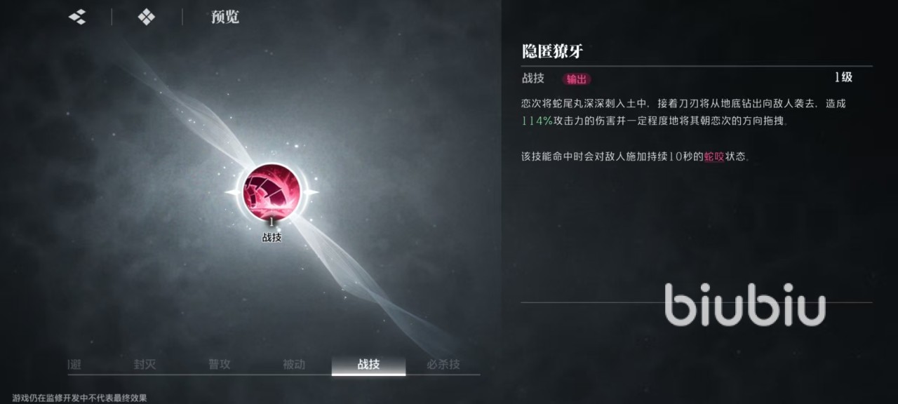因为是紫色品质,所以只有一个核心被动和两个增强被动。核心被动撕裂,释放普攻分支期间,对敌人施加持续的撕裂值,积累100点撕裂值就可以触发一次撕裂造成伤害。在增强被动的影响下,撕裂造成伤害提升,每次对敌人施加撕裂值速率提升。战记隐匿獠牙,将蛇尾丸刺入土中,刀刃从地底钻出向敌人袭去,造成伤害后将目标朝阿散井恋次方向拖拽。技能命中时会对敌人施加持续十秒的蛇咬状态。