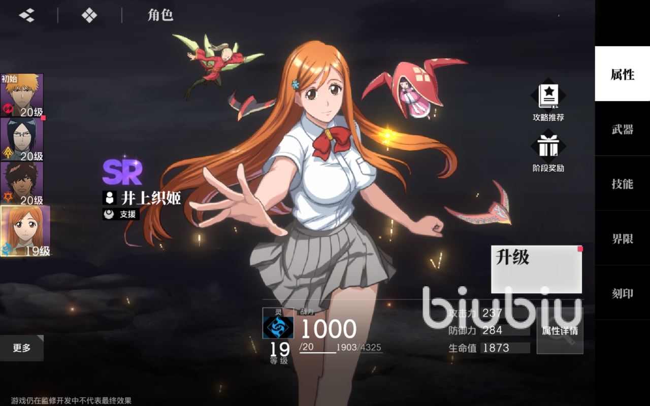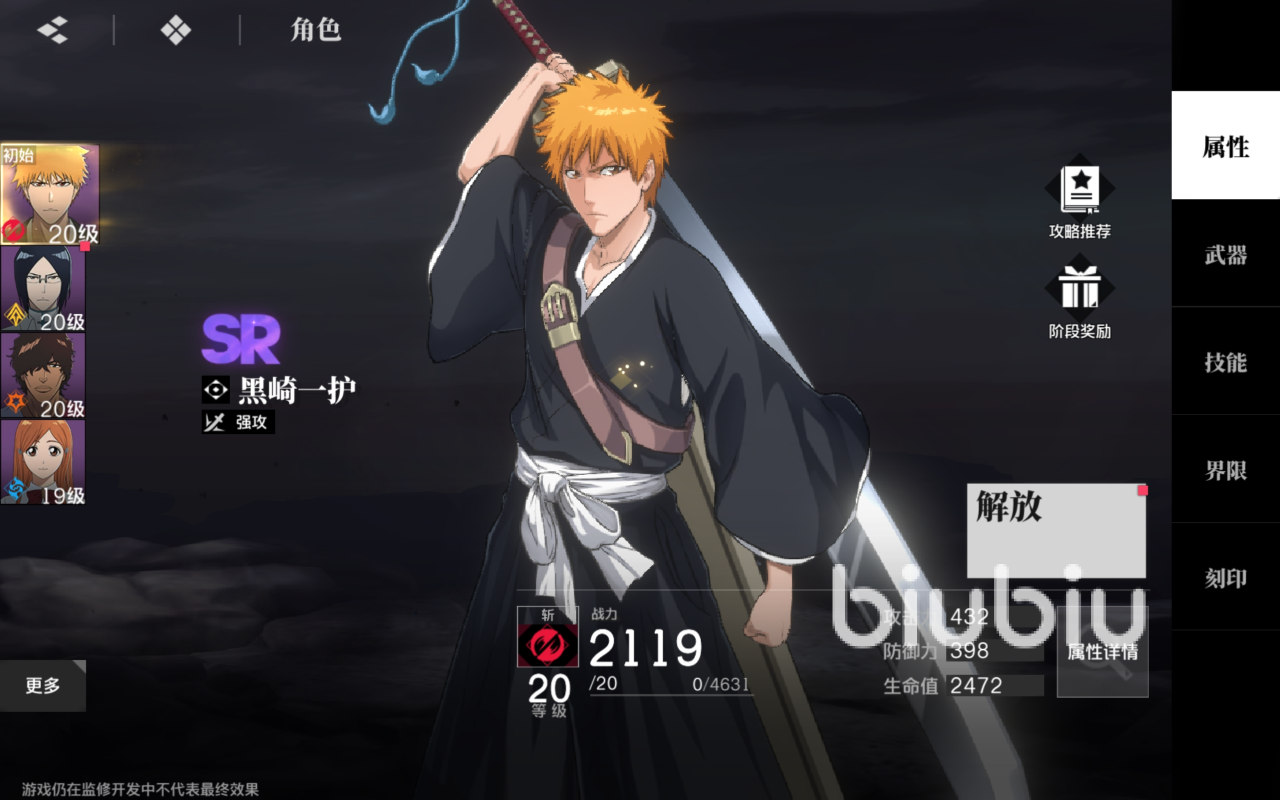 到了游戏中期阶段,角色可以扩展到朽木露琪亚和石田雨龙这两个。朽木露琪亚是冰系控制核心,石田雨龙是远程输出角色。后期培养的重点应该放到黑崎一护万解上,这是目前真正的主c,适合于很多人选择,培养强度提升之后输出非常可观。除了黑崎一护万解之外,另一个朽木白哉也适合当做主c培养。