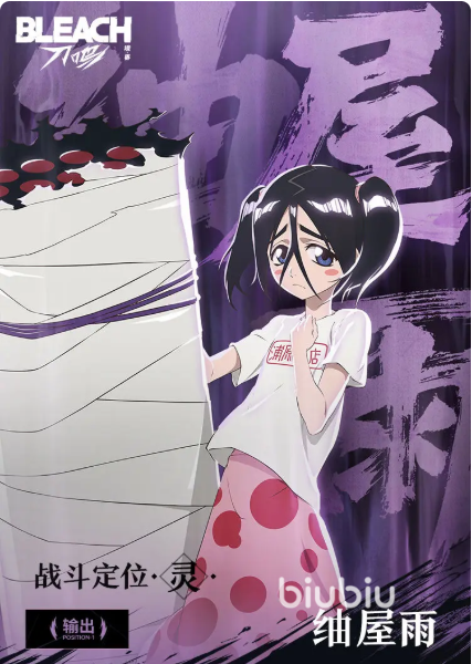 她是浦原商店的店员,长相十分可爱,但是却具有超人的战斗能力;游戏中她是个强力的输出型角色,通过领子大炮能持续射击灌伤展开攻击,在战斗中制造燃烧区域持续打出范围伤害,提高输出。普攻对目标近身打击,敌人受到多段伤害;普攻的分支会让她进入到瞄准状态,每次点击普攻可射出2枚炮弹,能穿透最多2个敌方单位,对穿透目标造成50%伤害,每次攻击都消耗1层灵压储能。