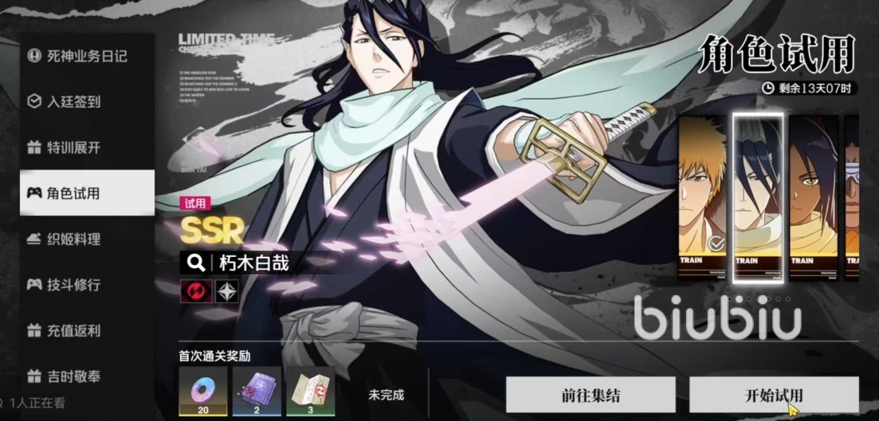 第1个推荐的是朽木白哉,朽木白哉是属于SSR级别的战术角色,它具有高控制的特点,技能光阵,可以限制敌人行动,当朽木白哉的战场技生效时,队伍中所有角色的斩系伤害获得提升。朽木白哉可以向敌人发射剑刃造成高额攻击伤害,如果释放该技能后战场技能的归零,那么此时可以再点击战场技按钮,释放一次追加攻击。必杀技开启之后,召唤出千本樱帮助进行攻击,对敌人造成高额伤害并进入万解状态,此时普攻和战技都将获得强化。万解将持续15秒钟,即使被换下场也不会解除。