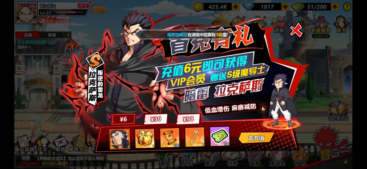 最后一个建议大家充值的点就是我们的首充了,首充六元就可以获得暗雷拉克萨斯,大家只要稍微培养一下,就可以激活成ss级别的拉克萨斯,他在战斗中可以有滴血增伤以及麻痹减防的特别效果,当然首充之后还会获得一个神秘礼包,再加上100个探险券,黄金钥匙是不可能少的。