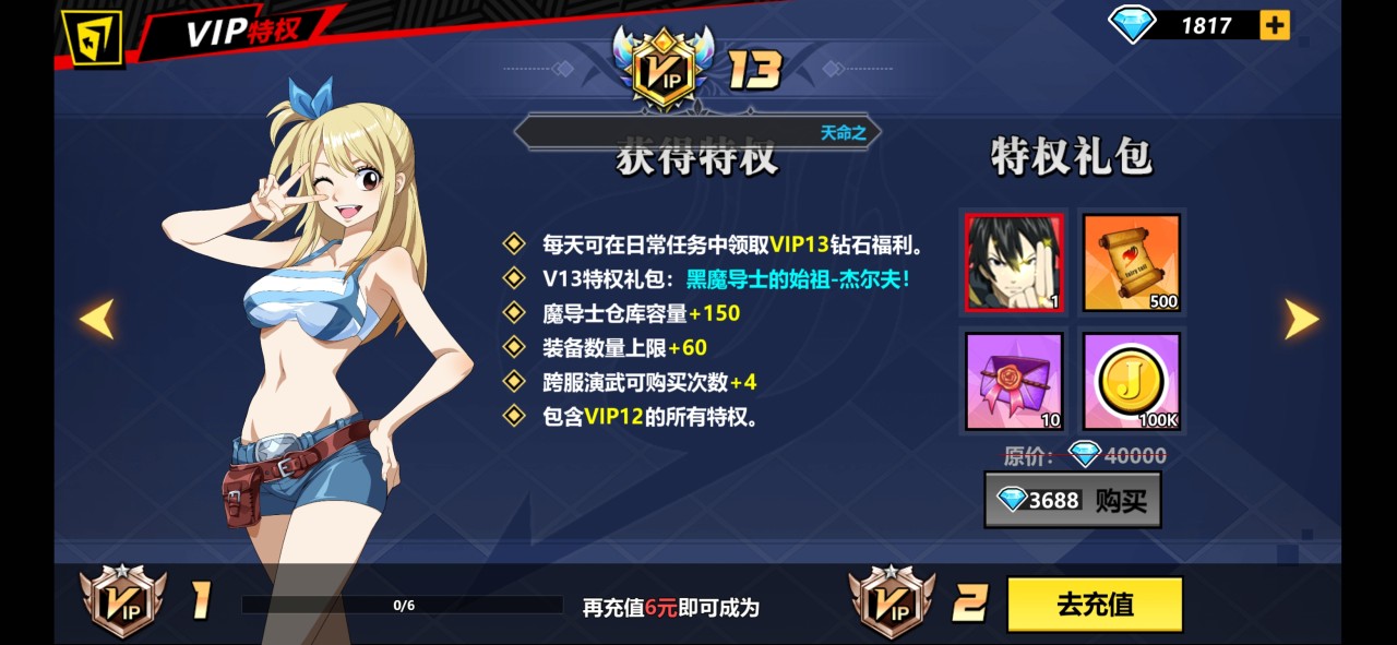 首先,小编建议充值的第一个内容就是VIP了,其实VIP只需要充值一些钱,然后进行消费就可以获得VIP特权,当大家升级到VIP13特权之后,每天都可以在日常任务中领取大量的钻石奖励,如果刚到达VIP13的话,可以获得一个特权礼包,就是黑魔导士的始祖吉尔夫,这个角色在这个游戏的现版本之中可谓是最强的一个输出位,不管搭配什么阵容都可以发挥到极致的力量。