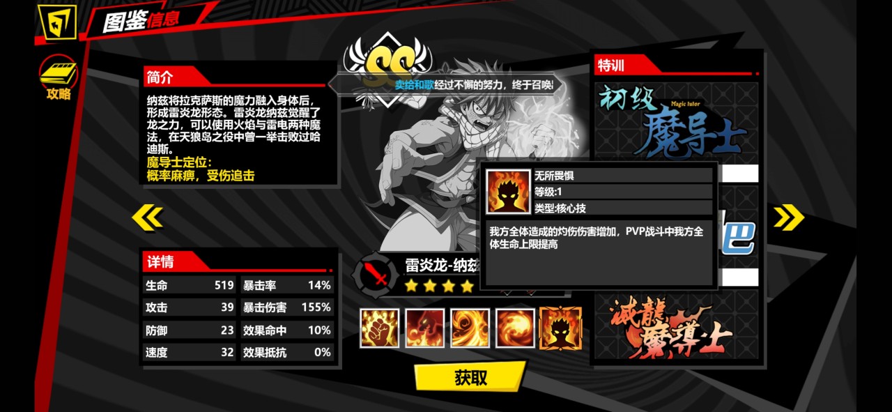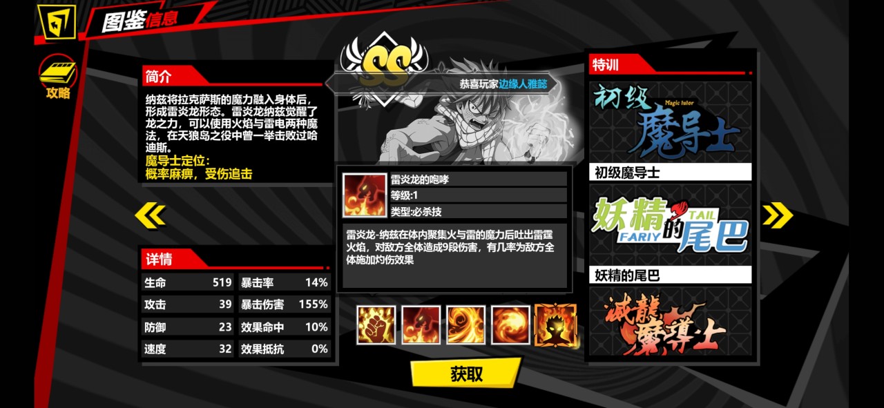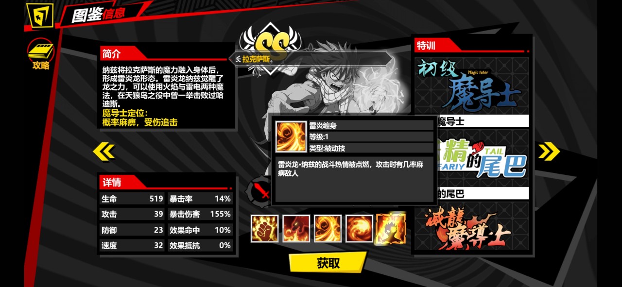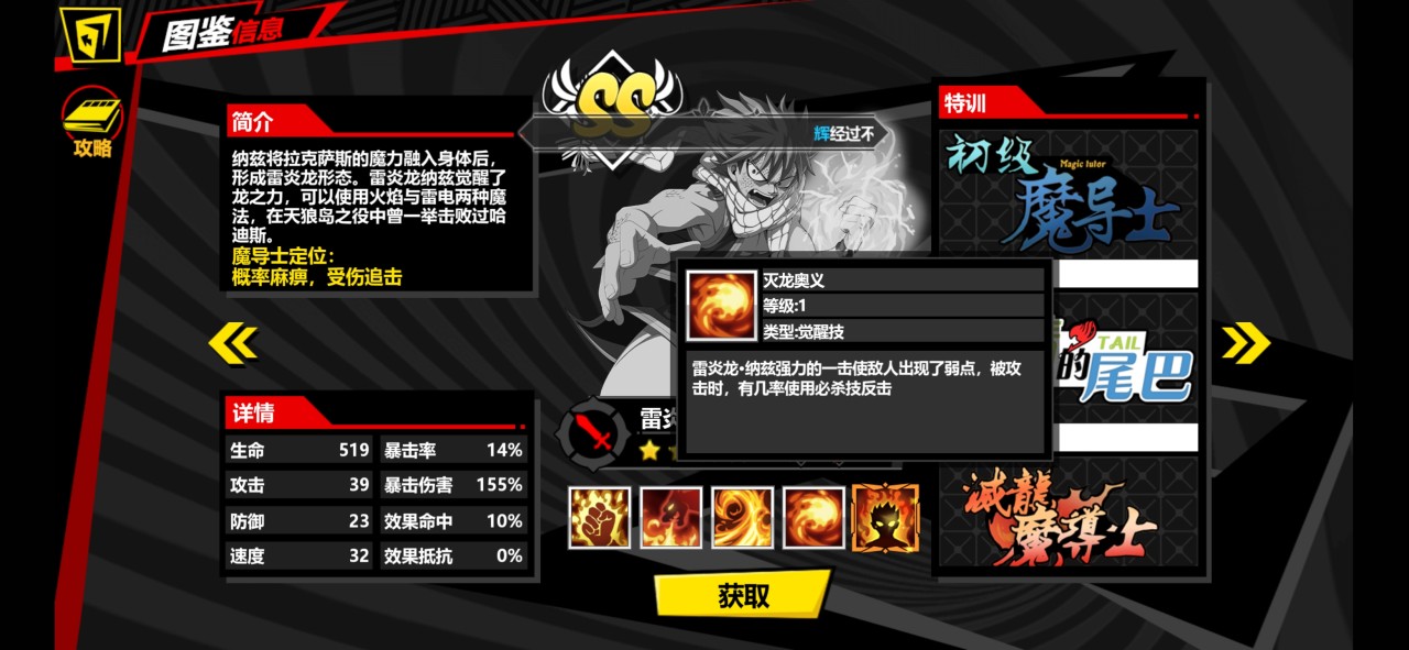 然后就是他的觉醒技能了,名字叫做灭龙,奥义雷炎龙纳兹强烈的一集是敌方出现了弱点,被攻击的时候就会有几率使用必杀技进行反击,所以介绍一下必杀技就很有必要了,他的被动是受到伤害,会自动普通攻击进行反击,而这个被动技能决定了他会使用必杀技进行反击。他的必杀技叫做雷炎龙的咆哮,它在体内聚集火与雷的魔力后,吐出雷霆火焰,可以对敌方全体造成九次的魔法伤害,并且每段伤害之后都会附带大量的灼烧效果,如果再配合被动技能的话,都可以进行麻痹状态。