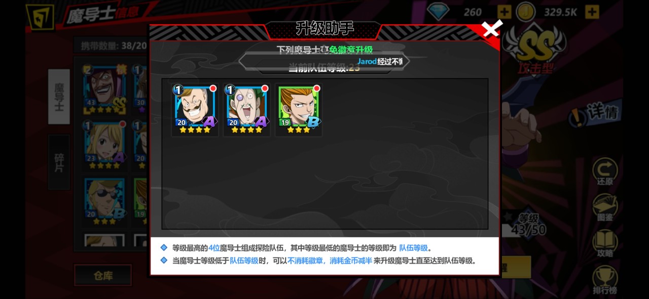 首先就是最简单的升级角色,前期我们获得b级角色a级角色的时候,不要一味的将材料都用到他们身上,将所有的材料主要升级给火龙就可以,因为你会发现,做着做着任务就会来几张s级的卡牌,如果大家把材料都用到了b级卡牌上,最后就会哭了,S级卡牌虽然厉害,但是不培养也是不行的呀,如果各位玩家的卡牌都到达了20级左右的话,就可以进行免费徽章升级,等级最高的四位魔导士组成探险队伍的时候,其中等级最低的魔导师的等级就成为了队伍的等级,如果魔导师的等级低于队伍等级的时候,可以不消耗徽章,消耗的金币减半来直接升级魔导士,直到队伍等级达成。
