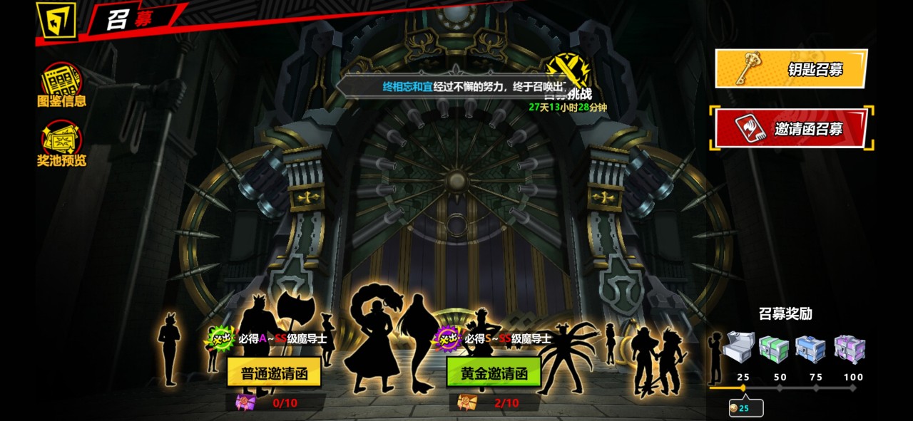 第二个就是关于新手玩家的招募问题了,小编在这里还是建议大家一定要攒够十个邀请函或者是钥匙再去抽奖,一个一个的抽真的概率太小了,前期获得邀请函或者钥匙的机会也是非常多的,大家有耐心一点集齐十个再去抽奖哟!你使用十个普通邀请函来个十发抽奖一定可以得到a级或者是ss级魔导士,如果使用黄金邀请函的话,就会获得s级到ss级魔导士,是不是十分诱人呐?