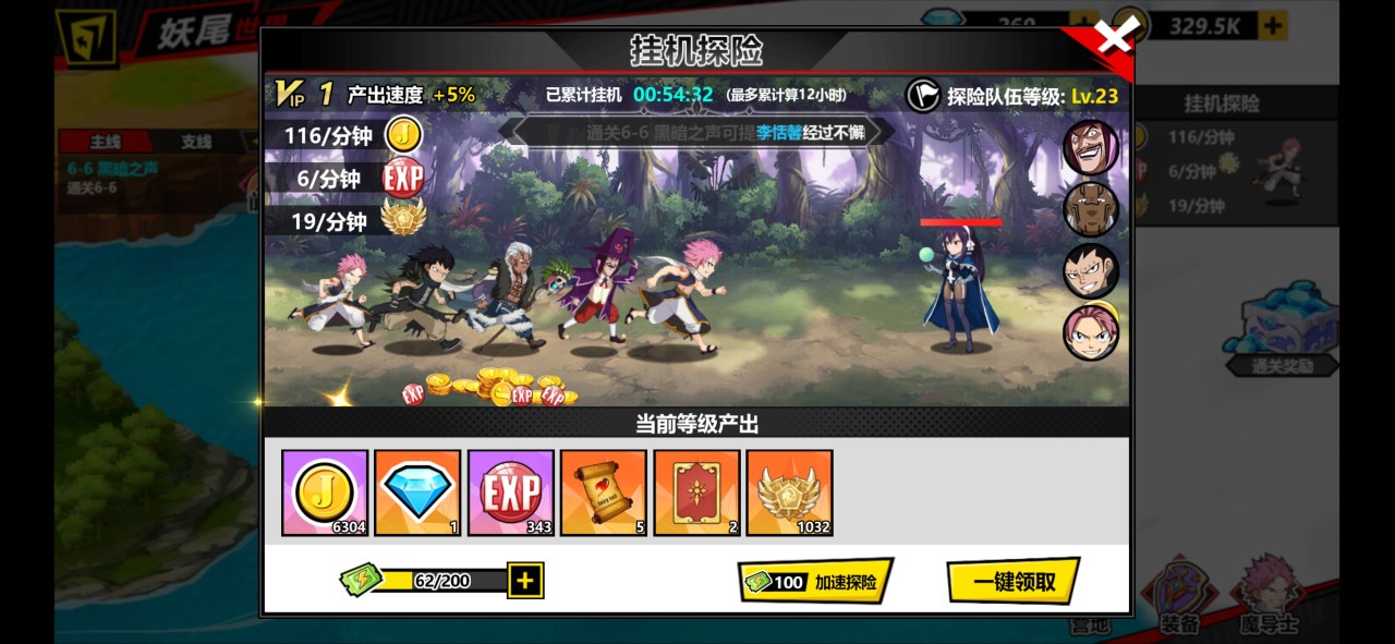 最后就是挂机探险问题,各位玩家虽然下线的话,但是系统会自动进行挂机状态,如果你是VIP1的话,产出的速度会提升5%,获得的材料分别有金币,钻石,经验图腾以及各种徽章,当然,前期获得加速探险券的概率也是十分的大的,各位玩家可以使用加速探险券来提高自己前期的发育。