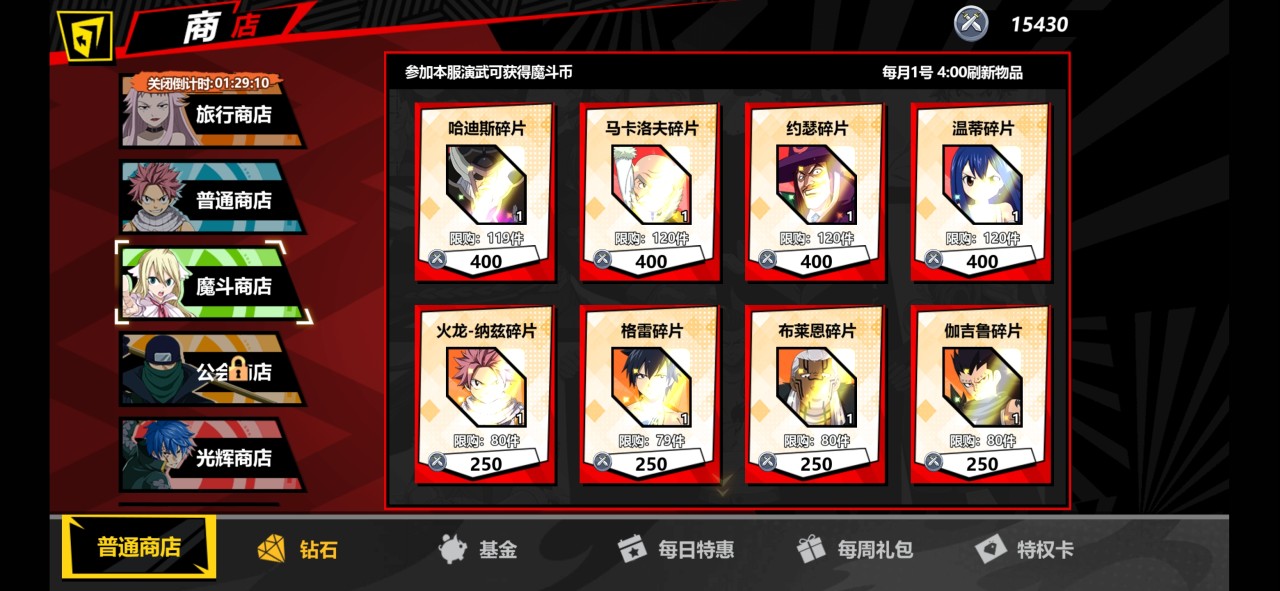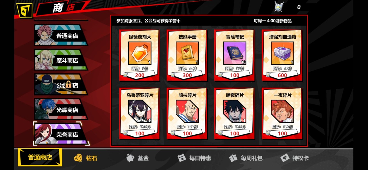 首先右下角的商店一共分为七种,普通商店,魔豆商店,公会商店,光辉商店,荣誉商店以及神秘商店,每种商店交易的货币都是不一样的,今天我们主要说一下这个荣誉商店里的荣誉币,他的获取方式主要有两种,一个是跨服演武与其他区服的魔导士进行pk,另一种就是工会战了,与其他服或者自己服的魔导士队伍,公会进行pk胜利或者失败都可以获得荣誉币。