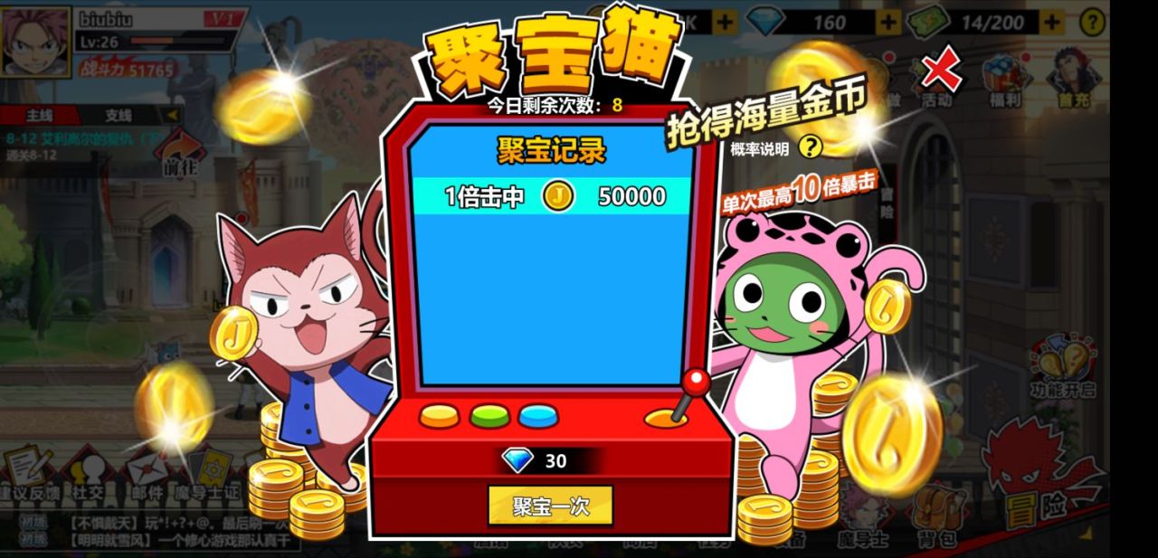 第二种消费钻石的方法就是去抽取金币,大家来到游戏主界面之后,上面有一个金币,右侧有一个加号,我们点击加号就会显示聚宝猫,接着游戏每天可以拒保聚宝一次免费,接下来几次就要消费钻石进行聚宝了,每次都可以获取大量的金币,金币,可以在神秘商店中购买各种钻石购买不到的材料,另外,游戏里魔导师的升级以及进阶都需要金币,而使用钻石来获取金币是最快捷的方法了。