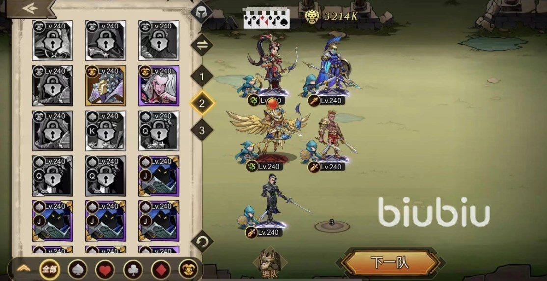 前文已经介绍了游戏里英雄有不同花色和鬼牌的区分,不一样的阵容、牌组加成属性也不一样。前排123号位通常是用来抗伤害,但并不建议3个全是肉,2个肉即可,另一个位置灵活变化,可以是有点坦度的输出,也可以是肉辅。